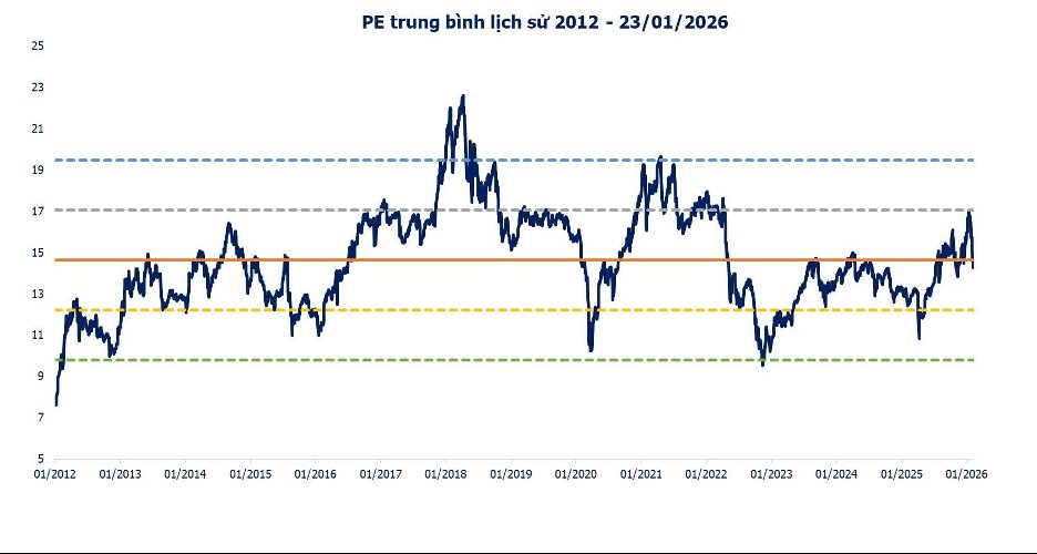 Về định giá, hiện tại, mức P/E thị trường đã về khoảng 14,2 lần, thấp hơn trung bình lịch sử. Trong bối cảnh lãi suất có xu hướng tăng, P/E thị trường có thể giảm thêm. Tuy nhiên, theo quan điểm của ông Huy, vùng P/E 13–14 lần vẫn tương đối hấp dẫn nếu xét tới triển vọng tăng trưởng kinh tế cao trong giai đoạn 2026–2030.