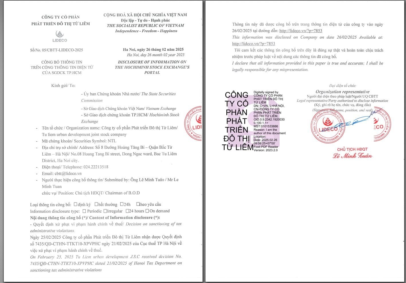 Mới đây, Lideco vừa công bố thông tin về việc nhận được Quyết định xử phạt vi phạm hành chính về thuế của Cục thuế TP.Hà Nội.