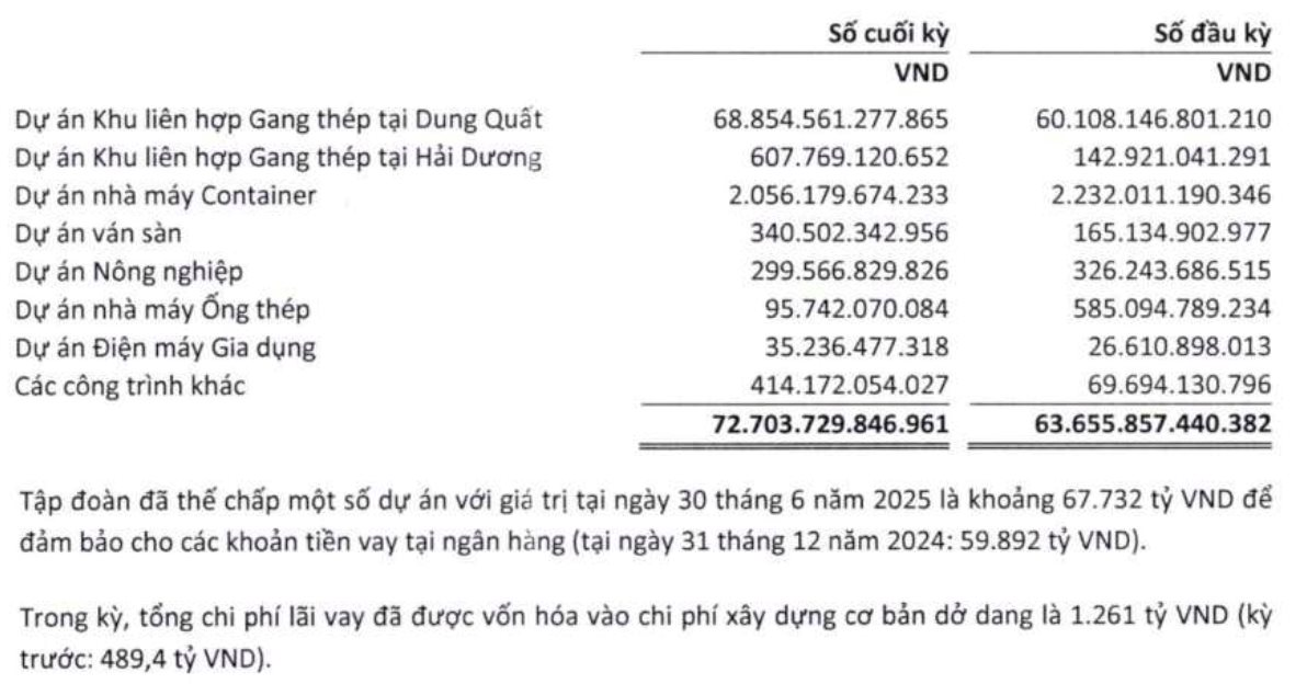 Tính đến ngày 30/6/2025, tổng tài sản của Hoà Phát đạt 242.224 tỷ đồng. Trong đó, chi phí xây dựng cơ bản dở dang chiếm nhiều nhất với hơn 72.000 tỷ đồng, chủ yếu là chi phí cho xây dựng dự án Khu liên hợp Gang thép tại Dung Quất (68.854 tỷ đồng), tăng hơn 8.000 tỷ so với đầu năm.