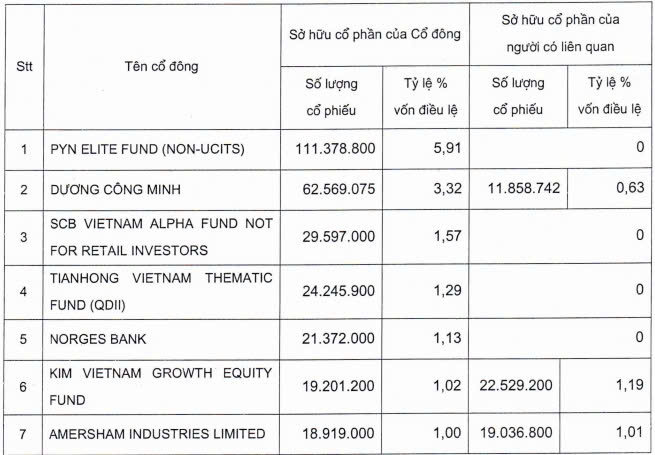 Theo đó, danh sách lần này có sự xuất hiện của 2 cổ đông tổ chức mới là KIM Vietnam Growth Equity Fund và Amersham Industries Limited.