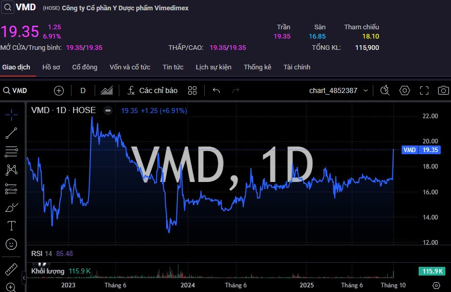 Tương tự, cổ phiếu VMD ghi nhận trạng thái “trắng bên bán”, thị giá leo lên 19.350 đồng/cp, vùng giá cao nhất trong vòng hơn 2 năm qua.