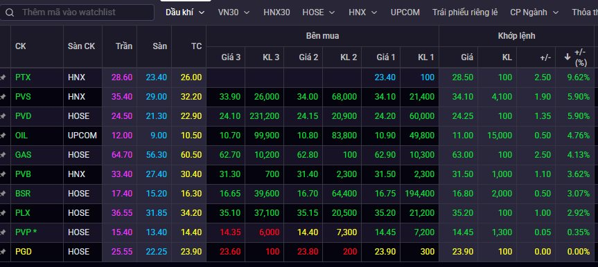 Bên cạnh đó, OIL, GAS, PVB, BSR,... đồng thuận bật tăng từ 3% đến gần 5%. Đặc biệt, cổ phiếu PTX còn tăng sát mức giá trần, thị giá PTX tăng 9,62% lên 28.500 đồng/cp, tuy nhiên chỉ có 100 cổ phiếu được khớp lệnh.