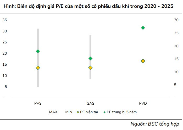 Sang năm 2026, BSC cho rằng triển vọng giữa các doanh nghiệp sẽ có sự phân hóa. Những doanh nghiệp có backlog tốt, ký kết giá thuê tốt (PVS, PVD) vẫn duy trì được tăng trưởng, trong khi GAS sẽ gặp mức nền lợi nhuận cao của năm 2025 do hoàn nhập chi phí trong khi nguồn khí LNG chưa đủ bù đắp xu hướng giảm của khí tự nhiên. Đối với BSR năm 2026 có thể đối mặt với thách thức từ giá dầu thô giảm và biên crack thu hẹp, nhưng được hỗ trợ bởi sản lượng tiêu thụ tiếp tục phục hồi.