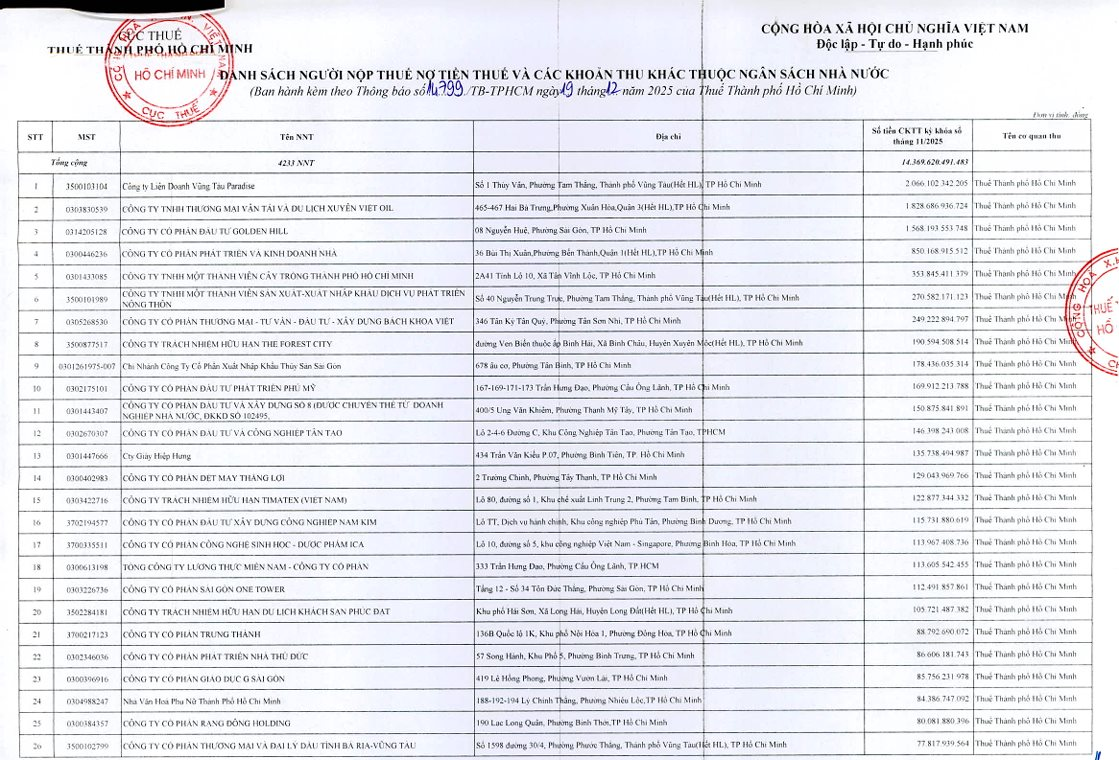 Thuế Thành phố Hồ Chí Minh vừa thực hiện công khai thông tin 4.233 người nộp thuế còn nợ tiền thuế và các khoản thu khác thuộc ngân sách nhà nước đến thời điểm tháng 11 năm 2025 với số tiền là 14.369,6 tỷ đồng.