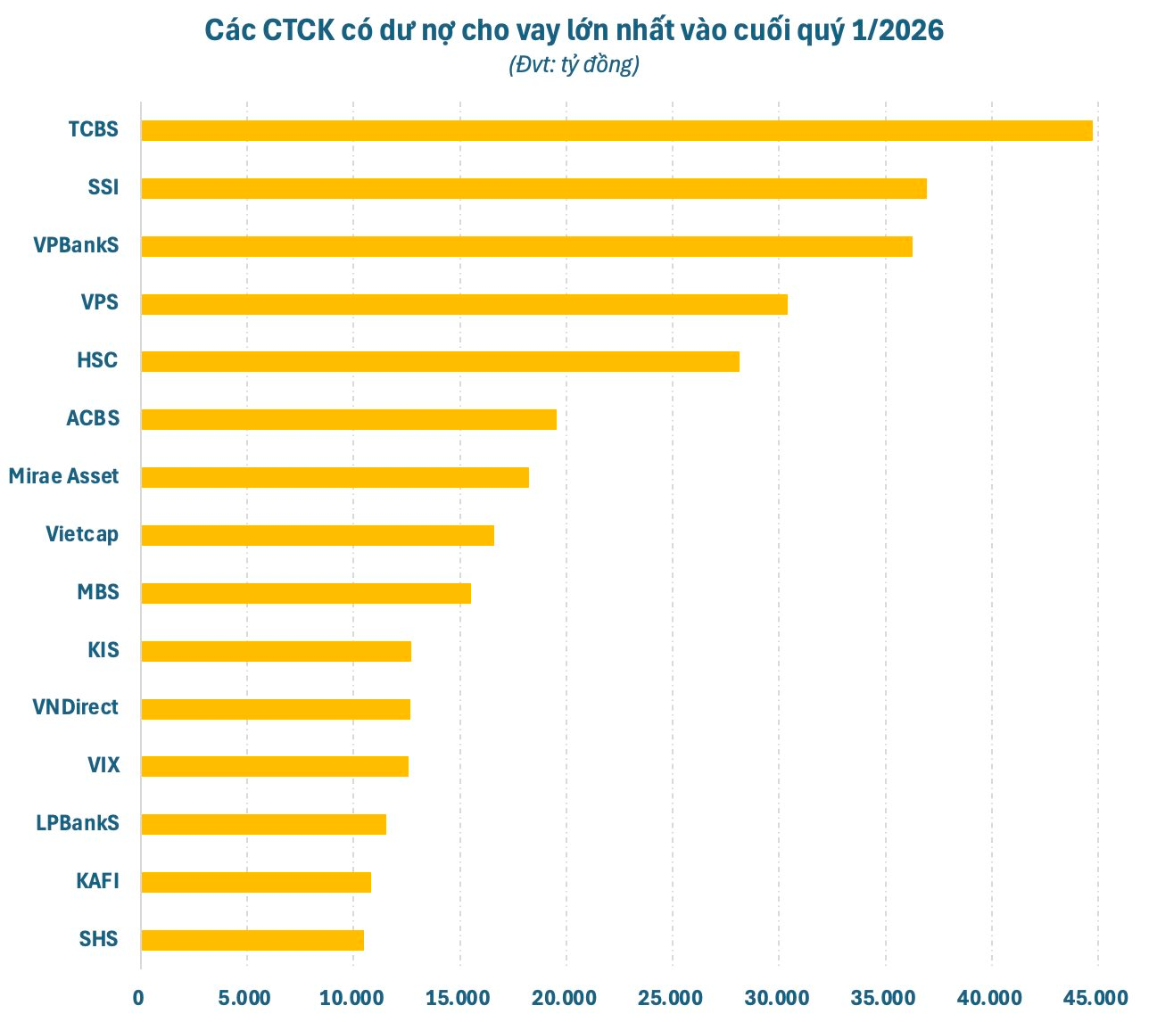 Tính đến cuối quý 1/2026, dư nợ cho vay (bao gồm margin và ứng trước tiền bán) tại các CTCK ước tính vào khoảng 415.000 tỷ đồng, tăng khoảng 9.000 tỷ so với cuối năm 2025. Trong đó, dư nợ cho vay ký quỹ (margin) ước tính khoảng 405.000 tỷ đồng, tăng 13.000 tỷ sau quý đầu năm và cũng là con số cao nhất trong lịch sử chứng khoán Việt Nam.
