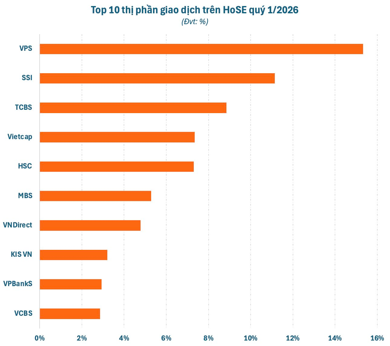Một trường hợp khác là VPBankS, CTCK này có dư nợ cho vay hơn 36.000 tỷ đồng tại ngày 31/3, xếp thứ 3 toàn ngành. Tuy nhiên, thị phần giao dịch quý 1 trên HoSE của VPBankS chỉ vỏn vẹn 2,94% - xếp thứ 9. Trong khi đó, VPS dẫn đầu về thị phần môi giới với con số vượt trội là 15,32% lại cho dư nợ cho vay thấp hơn đáng kể, chỉ khoảng 30.000 tỷ vào cuối quý 1.