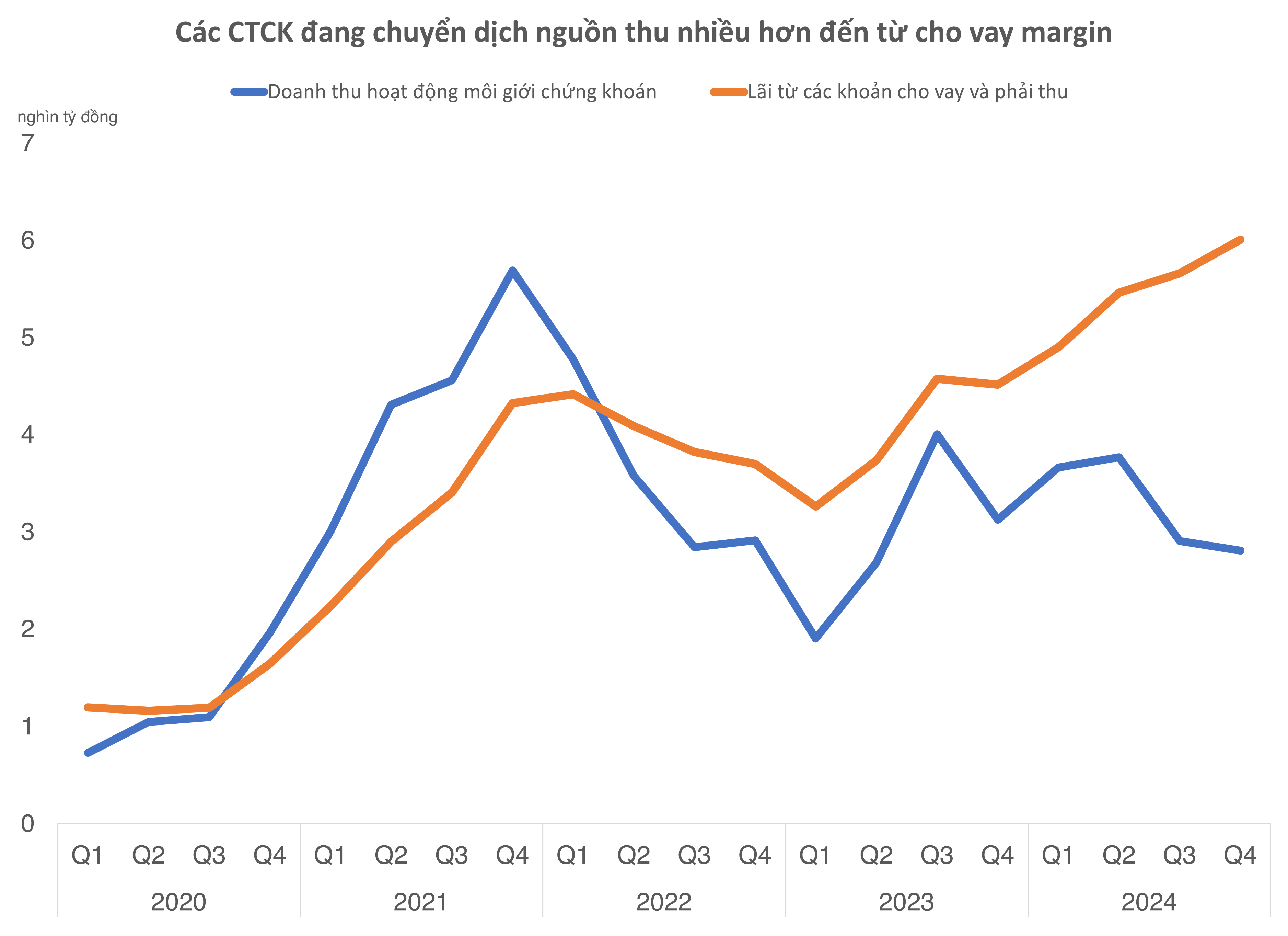 Nếu như phí từ môi giới suy giảm do thị trường "nguội lạnh" và sự cạnh tranh từ Zero-fee, lãi từ cho vay đang liên tiếp phá các kỷ lục, đạt trên 6.000 tỷ đồng.