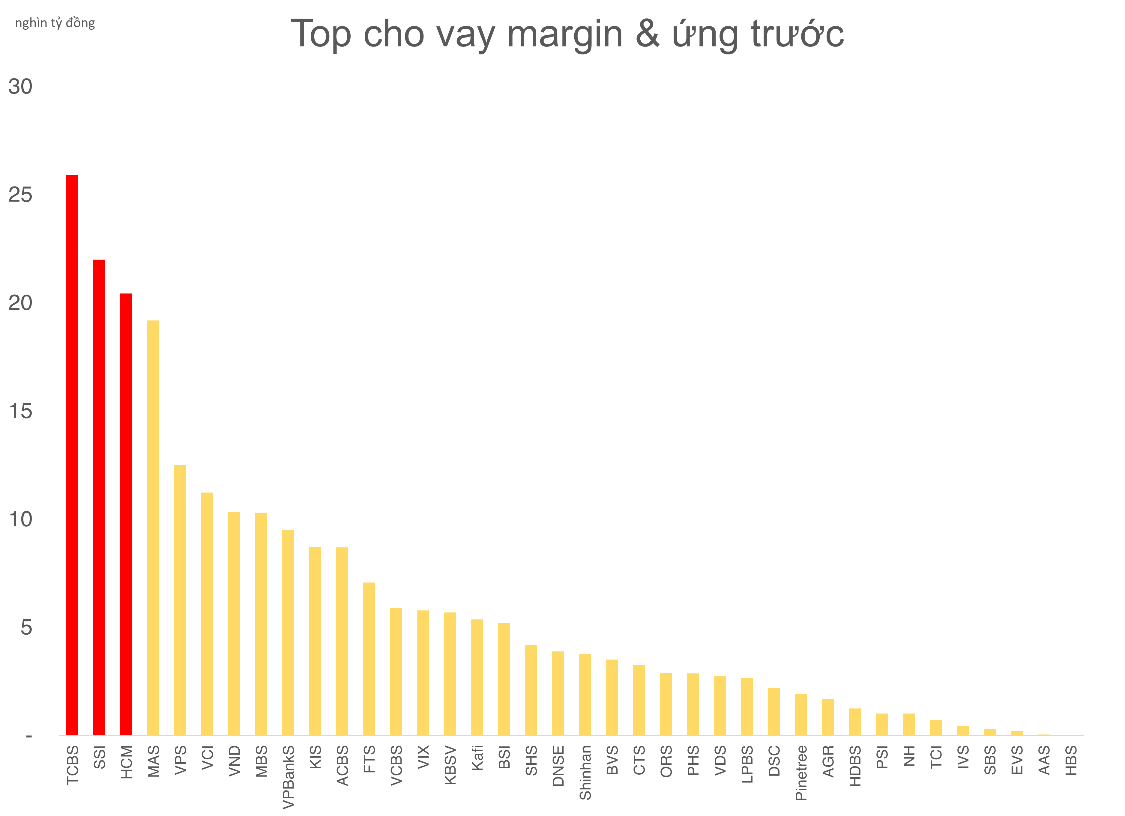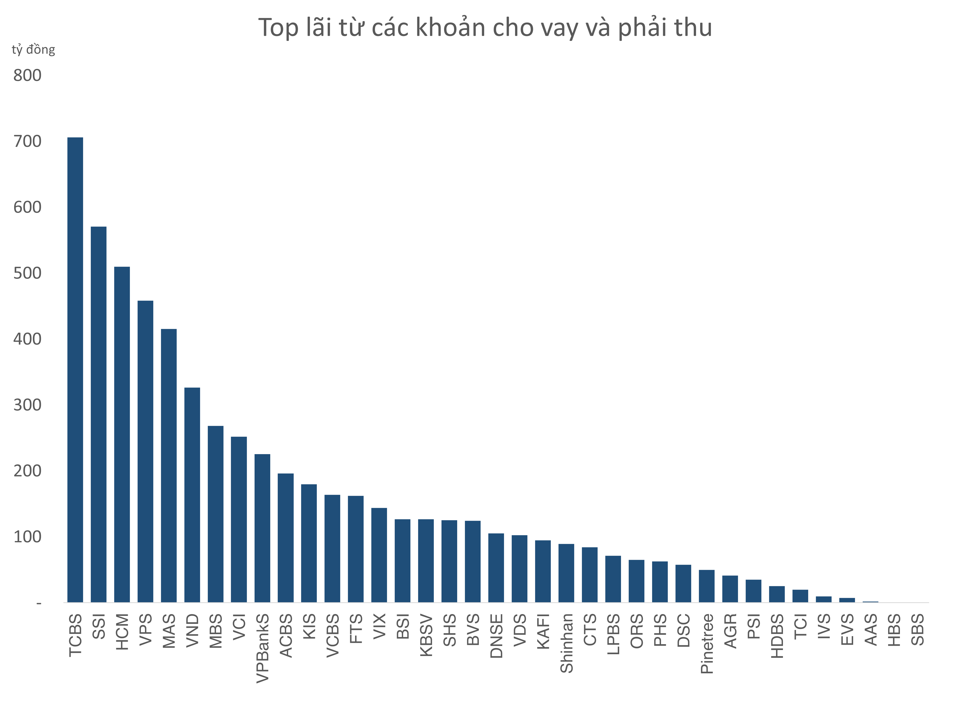 Chứng khoán TCBS tiếp tục là CTCK thu được nhiều lãi nhất từ cho vay margin và phải thu, đạt 700 tỷ đồng. Trong khi, SSI (570 tỷ đồng), HSC (509 tỷ đồng) cũng thu lãi trên 500 tỷ đồng.