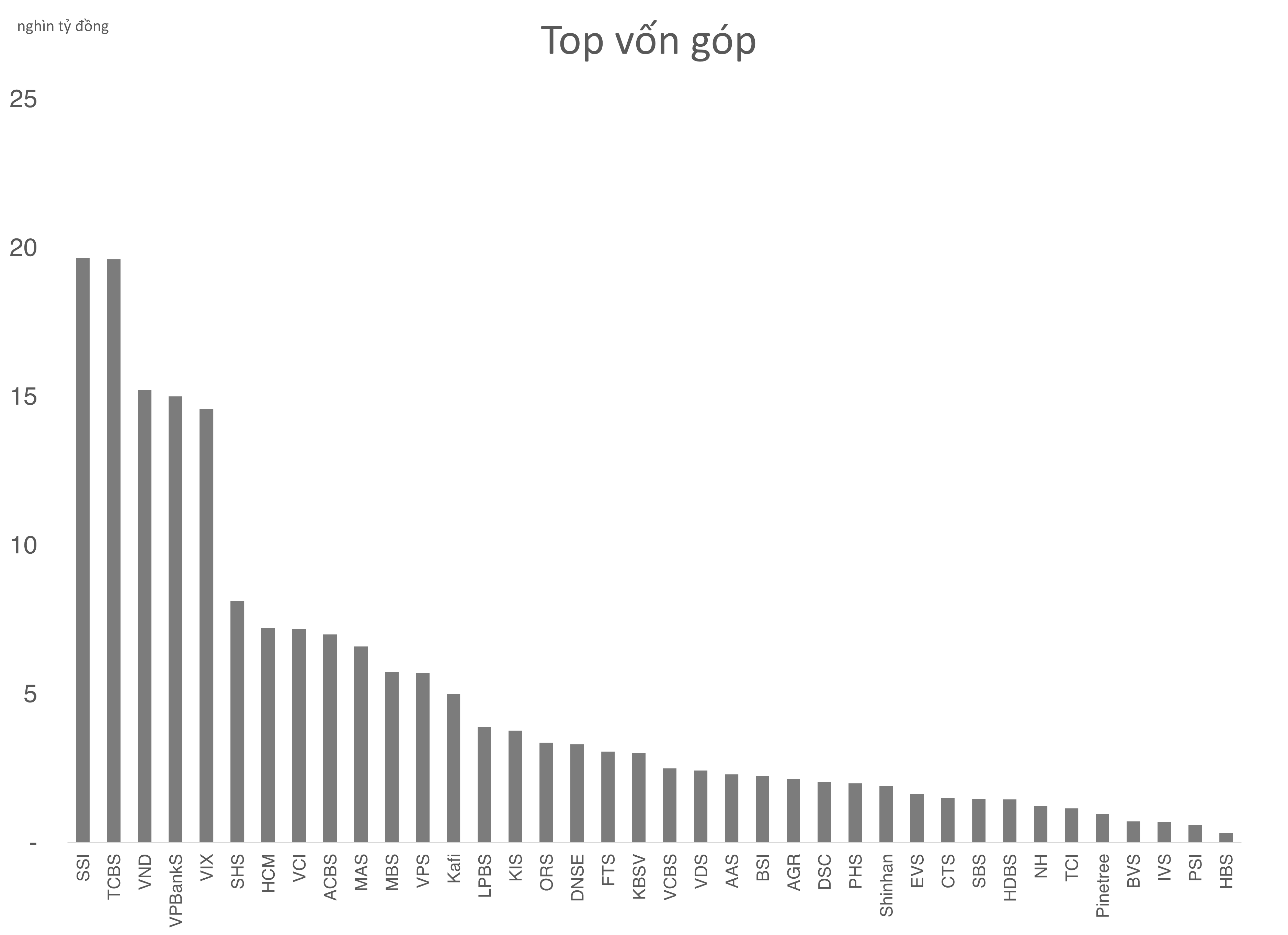 Xét về quy mô vốn điều lệ, Chứng khoán SSI đã kịp trở lại ngôi vị quán quân với 19.638 tỷ đồng, kế đến là TCBS với 19.613 tỷ đồng và VND với 15.222 tỷ đồng.