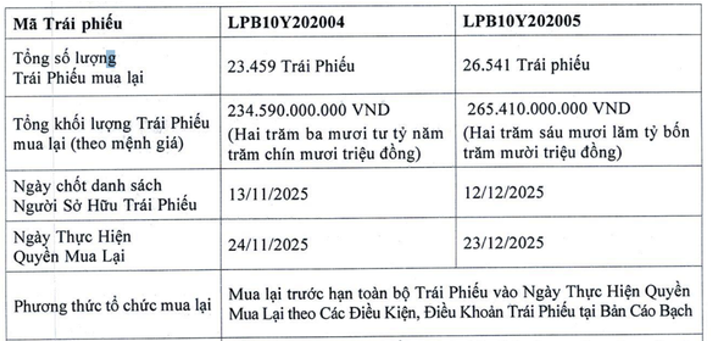 Ngày 25/9/2025, ngân hàng chi 1.000 tỷ đồng để mua lại toàn bộ lô trái phiếu mã LPBL2326002, phát hành ngày 25/9/2023, dự kiến đáo hạn năm 2026.