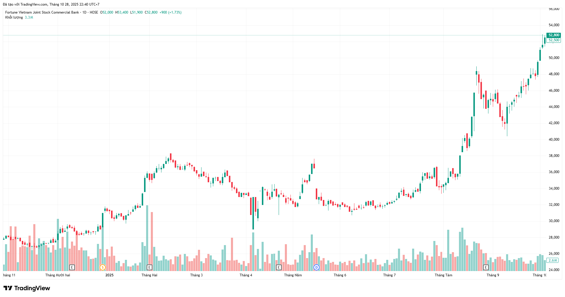 Kết thúc phiên giao dịch ngày 28/10, giá cổ phiếu LPB ở mức 52.800 đồng/cổ phiếu, tăng gần 69% so với đầu năm.