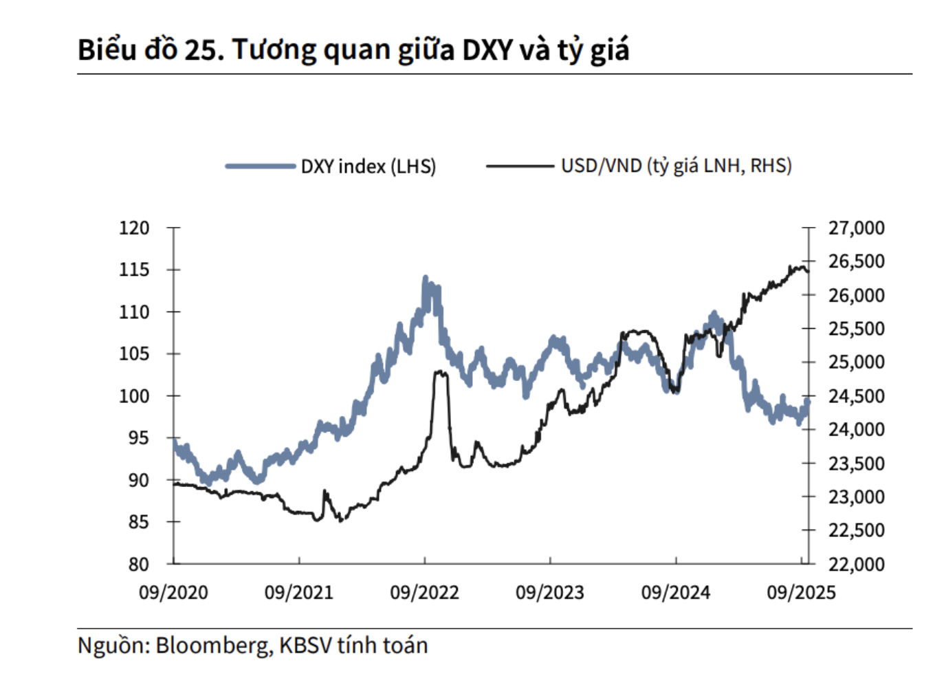 KBSV dự báo, trong quý IV/2025, tỷ giá USD/VND sẽ không tăng vượt quá 4% so với cuối năm 2024. Trong ngắn hạn, tỷ giá có thể xuất hiện những giai đoạn căng thẳng cục bộ do nhu cầu ngoại tệ cao đến từ hoạt động rút vốn của nhà đầu tư gián tiếp FII, các doanh nghiệp FDI chuyển lợi nhuận về nước, nhu cầu mua USD của kho bạc cũng như của các doanh nghiệp xuất khẩu…