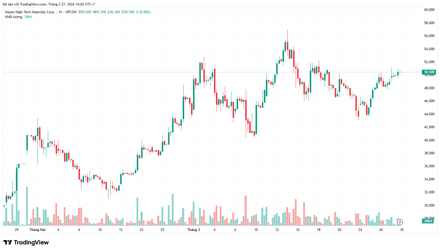 Kết thúc phiên giao dịch ngày 27/3, cổ phiếu MSR của Masan High-Tech Materials trên sàn UpCom ở mức 50.500 đồng/cổ phiếu, tăng gần 107% so với đầu năm 2026.