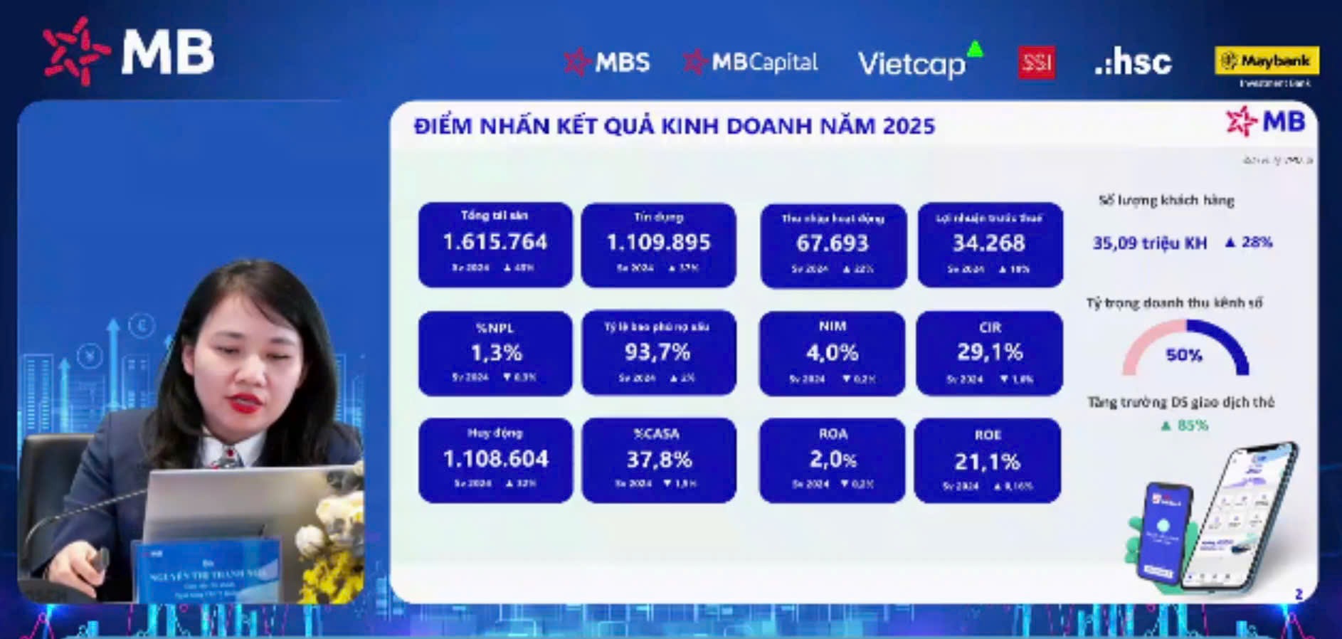 Tại hội nghị gặp gỡ nhà đầu tư chiều ngày 2/2, ban lãnh đạo Ngân hàng TMCP Quân đội (MB, mã MBB) đã thông tin về các chỉ số tài chính, hoạt động của ngân hàng trong năm 2025 và định hướng năm 2026.
