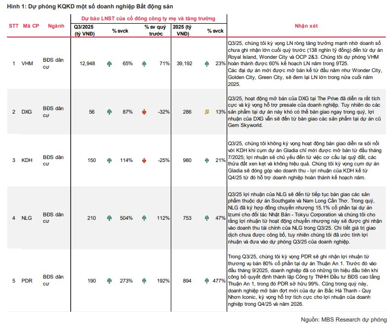 MBS cho rằng lợi nhuận của các doanh nghiệp bất động sản niêm yết theo dõi trong quý 3/2025 ghi nhận tăng trưởng 68,7% svck nhờ phục hồi từ nền thấp hoặc có hỗ trợ từ lợi nhuận tài chính đột biến trong quý. Các dự án mở bán mới trong quý của các doanh nghiệp kỳ vọng sẽ đóng góp vào kết quả kinh doanh kể từ quý 4/2025.