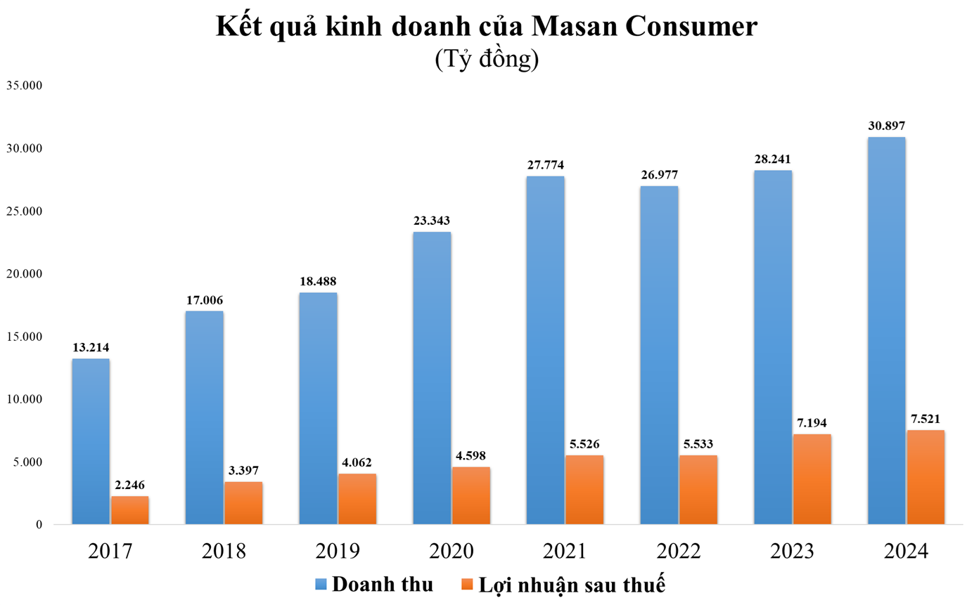 Trong những năm qua doanh thu và lợi nhuận của Masan Consumer liên tục tăng trưởng, bất chấp cả giai đoạn đại dịch Covid. Chỉ tính từ năm 2017 (khi MCH bắt đầu giao dịch trên UPCoM) đến năm 2024, doanh thu của MCH đã tăng gấp hơn 2,3 lần từ 13.214 tỷ đồng lên 30.897 tỷ đồng. Trong khi lợi nhuận sau thuế trong cùng giai đoạn tăng gấp 3,5 lần từ 2.246 tỷ đồng lên 7.921 tỷ đồng.