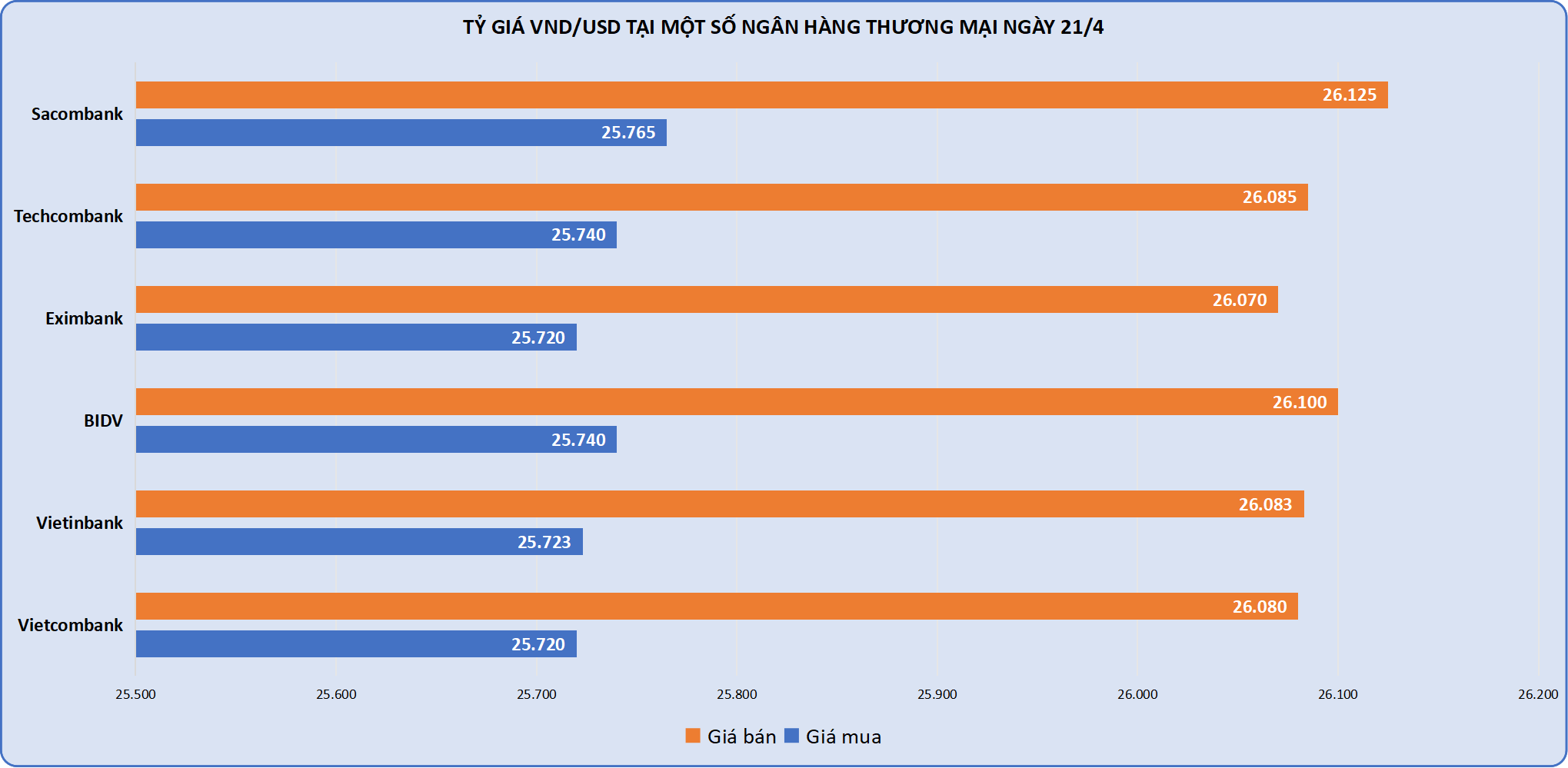 Tại Techcombank, giá USD điều chỉnh giảm 30 đồng ở mỗi chiều đang niêm yết ở mức 25.740 - 26.085 VND/USD. Sacombank niêm yết USD ở mức 25.765 - 26.125 VND/USD, giảm 60 đồng ở hai chiều mua - bán so với phiên trước đó.