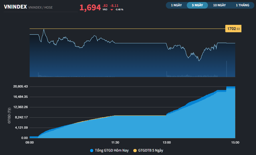 Chốt phiên, chỉ số VN-Index giảm 8,11 điểm xuống 1.694,82 điểm (-0,48%). Tổng khối lượng giao dịch sàn đạt 828,38 triệu đơn vị, tương đương 23.299 tỷ đồng.