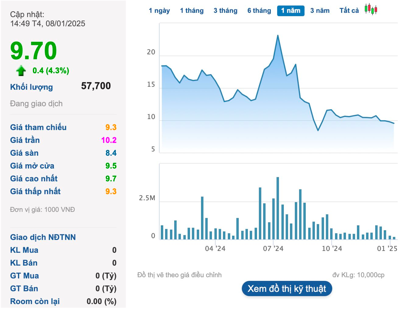 CMS rơi xuống đáy một năm vào đầu tháng 9 trước khi hồi phục nhẹ. Từ tháng 10/2024 đến nay, cổ phiếu này có xu hướng “sideway down”. Kết phiên 8/1, thị giá CMS dừng mức 9.700 đồng/cp, chỉ bằng khoảng 1/4 đỉnh lịch sử. Vốn hóa thị trường tương ứng gần 250 tỷ đồng.