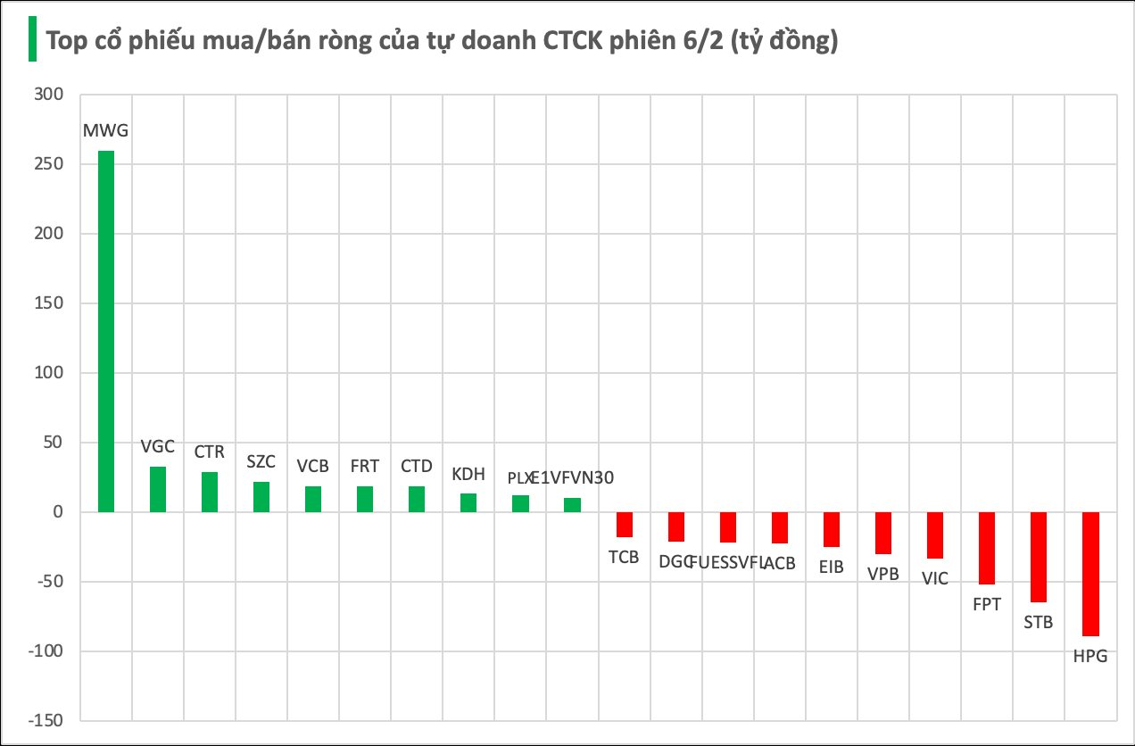 Cụ thể, nhóm tự doanh CTCK bán ròng mạnh nhất tại HPG với giá trị -89 tỷ đồng, tiếp theo là ACB (-65 tỷ), MWG (-52 tỷ), VIX (-33 tỷ) và VIC (-30 tỷ đồng). Một số cổ phiếu khác cũng ghi nhận lực bán ròng đáng kể như MBB (-25 tỷ), VHM (-23 tỷ), MSN (-22 tỷ), VJC (-21 tỷ) và TCB (-18 tỷ đồng).