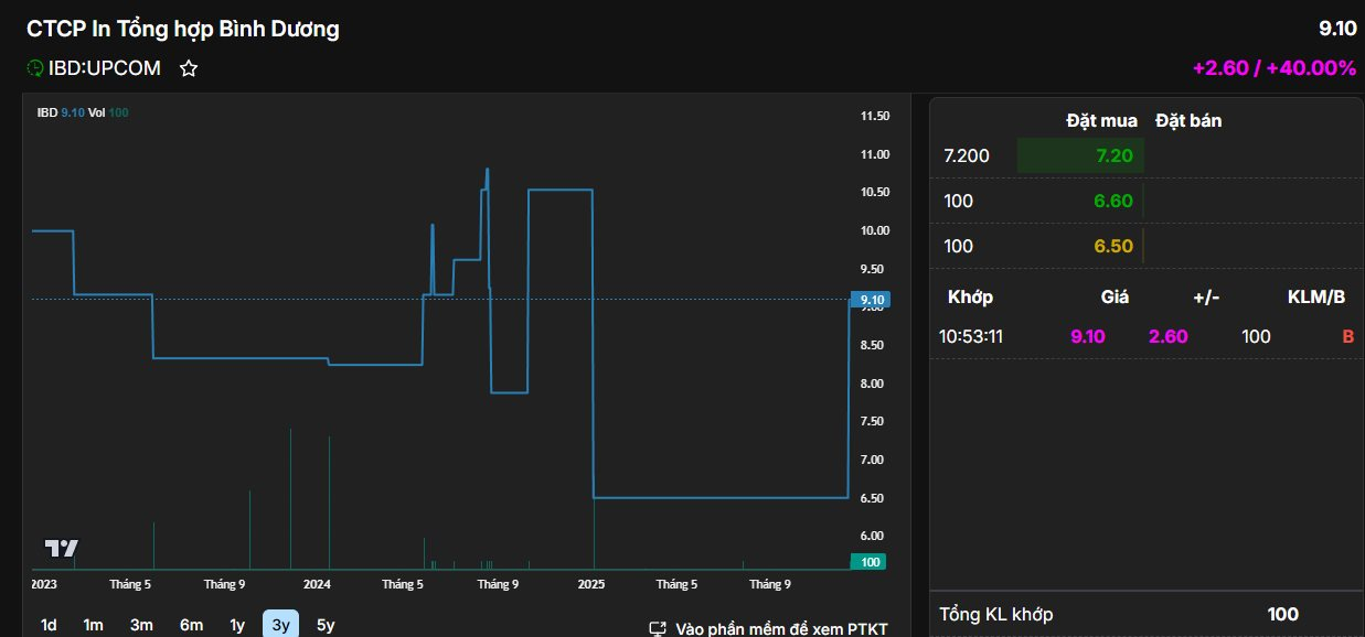 Cái tên mới nhất làm được điều hi hữu này là cổ phiếu IBD của CTCP In Tổng hợp Bình Dương. Cổ phiếu này vừa có phiên tăng kịch trần 40% trong phiên 12/12, dừng ở mức 9.100 đồng/cp.