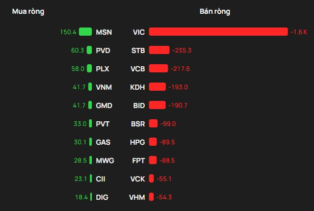 Tại chiều mua, cổ phiếu MSN được khối ngoại mua mạnh nhất trên HOSE với giá trị hơn 150 tỷ đồng. Theo sau, PVD và PLX là mã tiếp theo được gom mạnh 60 tỷ đồng và 58 tỷ đồng.