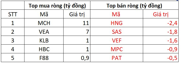 Chiều mua, cổ phiếu MCH được khối ngoại mua 11 tỷ đồng. Theo sau, VEA và KLB cũng được mua ròng mỗi mã vài tỷ đồng.