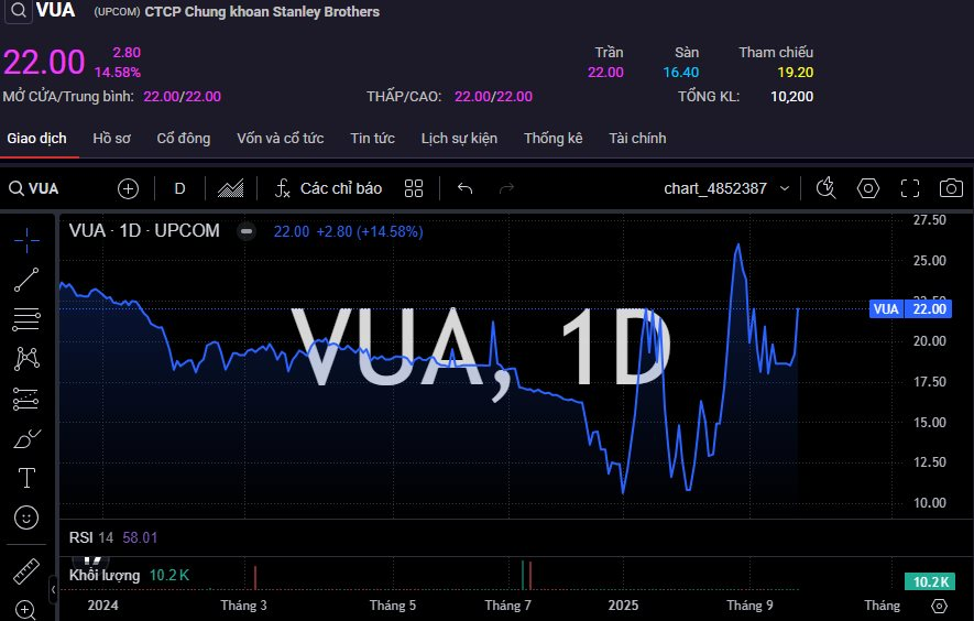 Giữa lúc VN-Index biến động giằng co, cổ phiếu VUA của CTCP Chứng khoán Stanley Brothers (SBSI) diễn biến khởi sắc với nhiều phiên tăng trần liên tiếp. Đóng cửa phiên 29/9, cổ phiếu VUA tiếp tục nhuộm “sắc tím” phiên thứ 3 liên tiếp, qua đó lên mức thị giá 22.000 đồng/cp, cao nhất từ đầu tháng.