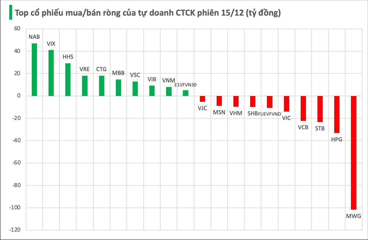 Cụ thể, nhóm tự doanh CTCK bán ròng mạnh nhất tại MWG với giá trị -102 tỷ đồng, tiếp theo là HPG (-33 tỷ), STB (-23 tỷ), VCB (-22 tỷ) và VIC (-14 tỷ đồng). Một số cổ phiếu khác cũng ghi nhận lực bán ròng đáng kể như FUEVFVND (-11 tỷ), SHB (-10 tỷ), VHM (-10 tỷ), MSN (-9 tỷ) và VJC (-5 tỷ đồng).