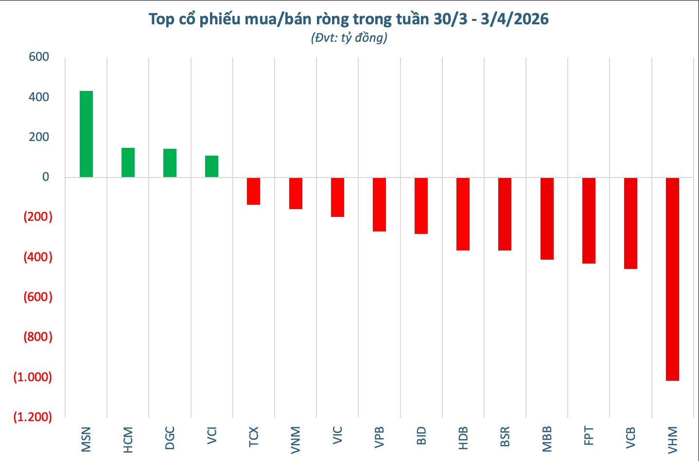 Ở chiều ngược lại, áp lực bán ròng tập trung mạnh vào nhóm vốn hóa lớn, trong đó VHM bị xả mạnh nhất với khoảng 1.017 tỷ đồng, tiếp đến là VCB (-456 tỷ đồng) và FPT (-431 tỷ đồng). Các mã khác cũng chịu áp lực rút vốn đáng kể như MBB (-410 tỷ đồng), HDB (-364 tỷ đồng), BSR (-364 tỷ đồng), BID (-283 tỷ đồng), VPB (-269 tỷ đồng), VIC (-196 tỷ đồng), VNM (-158 tỷ đồng) và TCX (-137 tỷ đồng).