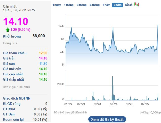 Trong bối cảnh thị trường chứng khoán Việt Nam hồi phục tích cực, cổ phiếu VTC của CTCP Viễn thông VTC trên sàn HNX tiếp tục trở thành tâm điểm. Đóng cửa phiên 26/11, thị giá VTC bốc đầu kịch trần phiên thứ 6 liên tiếp, qua đó lên mốc 14.100 đồng/cp, cao nhất trong vòng hơn 3,5 năm (kể từ tháng 4/2022).