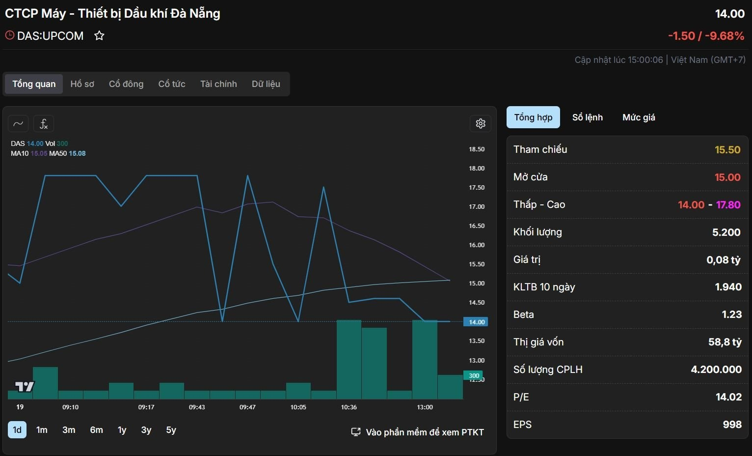 Trong phiên giao dịch ngày 19/11, có thời điểm, thị giá cổ phiếu DAS đã tiếp tục tăng trần chạm mức 17.800 đồng/cổ phiếu nhưng kết phiên lại bất ngờ đóng cửa ở mức 14.000 đồng/cổ phiếu, tức giảm đến 9,68% so với giá tham chiếu 15.500 đồng.