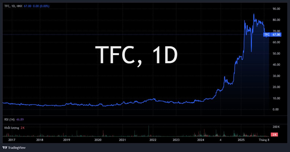 Trên sàn chứng khoán, cổ phiếu TFC hiện dừng ở mức 67.000 đồng/cp, tương ứng tăng hơn 40% kể từ đầu năm.