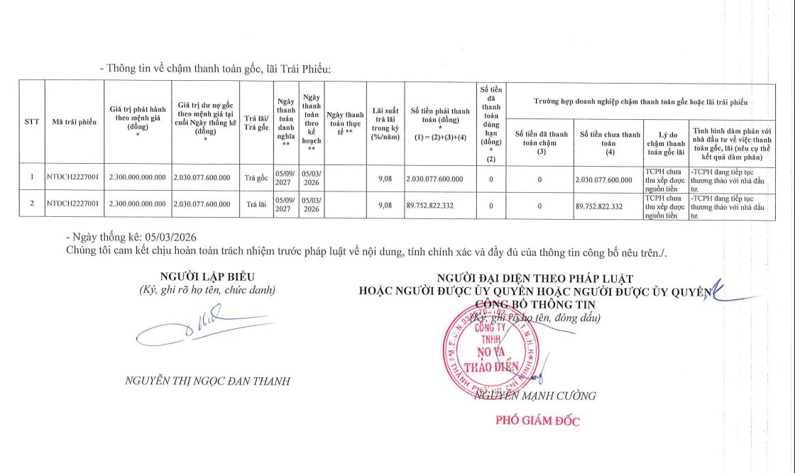 Tương tự, No Va Thảo Điền chậm thanh toán hơn 89,7 tỷ đồng lãi của lô trái phiếu NTDCH2227001 với lý do và tình hình đám phán như trên.