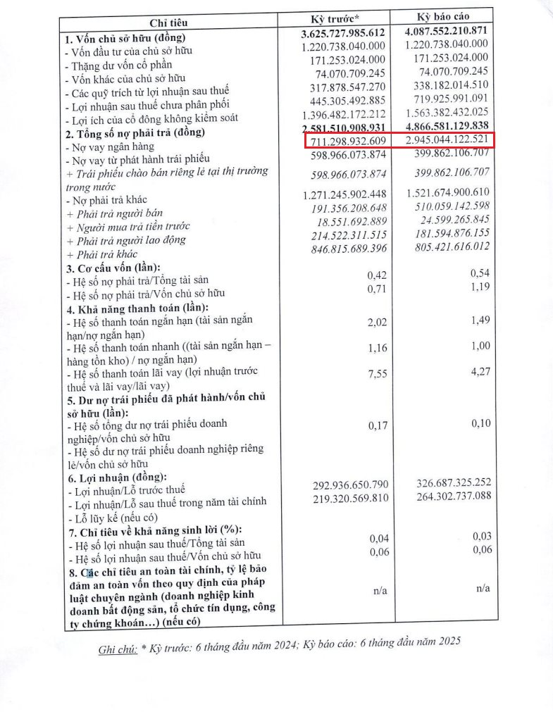 Hệ số nợ phải trả/vốn chủ sở hữu của doanh nghiệp tăng từ 0,71 lần ở cùng kỳ, lên 1,19 lần vào thời điểm cuối tháng 6/2025.