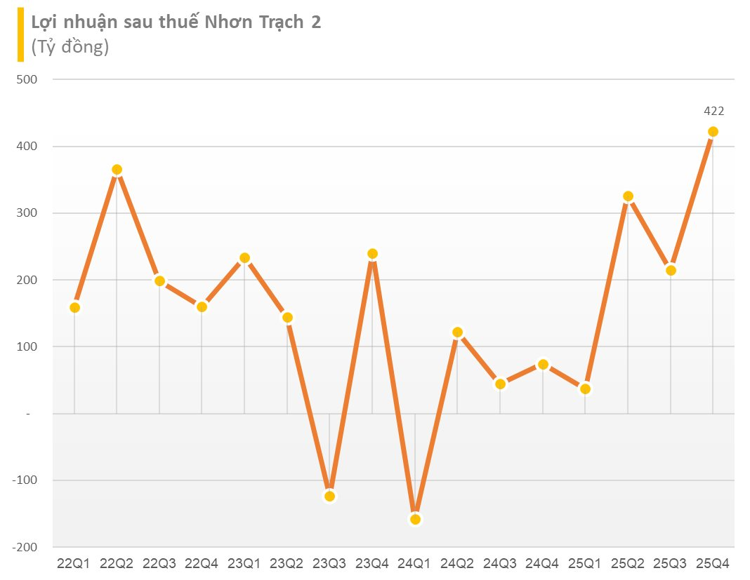 Trong quý 4/2025, NT2 ghi nhận doanh thu thuần đạt 2.367 tỷ đồng, tăng khoảng 33% so với mức 1.784 tỷ đồng của cùng kỳ năm 2024. Đáng chú ý, lợi nhuận sau thuế của doanh nghiệp đạt 422 tỷ đồng, tăng 466% so với con số gần 75 tỷ đồng của Quý 4/2024.