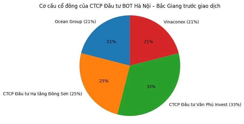 Trước khi thương vụ chuyển nhượng cổ phần diễn ra, cơ cấu cổ đông của CTCP Đầu tư BOT Hà Nội – Bắc Giang được phân bổ khá cân bằng giữa các cổ đông lớn. Trong đó, Ocean Group và Vinaconex cùng nắm giữ tỷ lệ 21% vốn điều lệ.