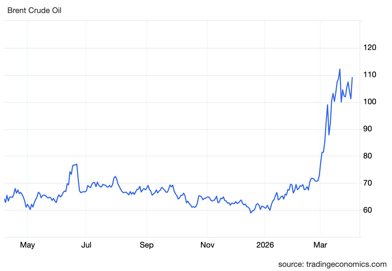 Tính đến cuối tuần giao dịch 30/3-3/4, dầu Brent giao dịch quanh ngưỡng 109 USD/thùng, neo gần vùng đỉnh của năm 2026 và tăng hơn 50% kể từ thời điểm Israel và Mỹ bắt đầu triển khai chiến dịch quân sự tại Iran.