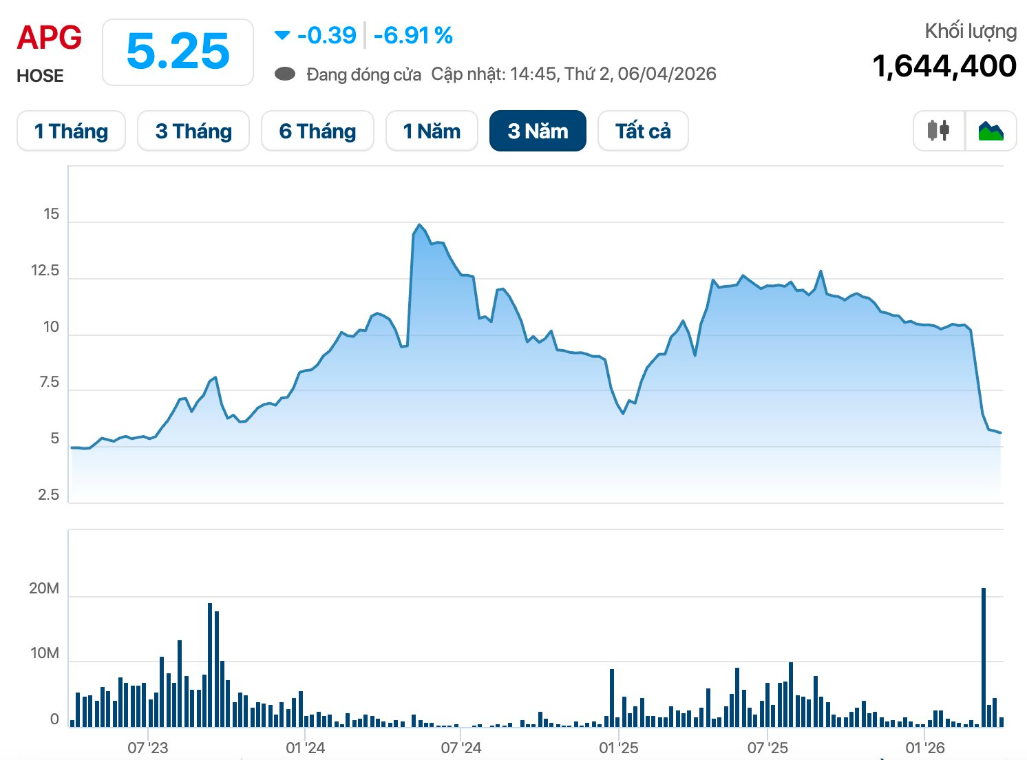Trên thị trường, cổ phiếu APG chốt phiên 6/4 giảm sàn về 5.250 đồng/cp.