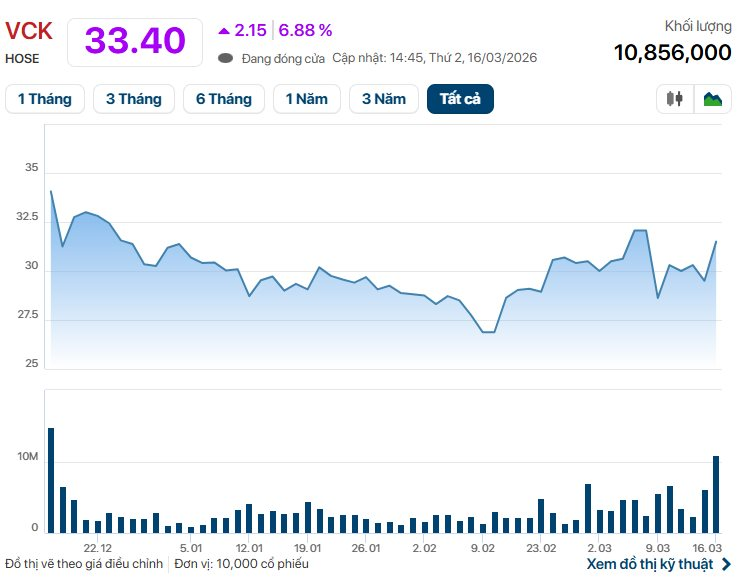Nhìn lại, phiên 16/12/2025, cổ phiếu VCK của CTCP Chứng khoán VPS chính thức chào sàn HoSE, với giá tham chiếu trong phiên giao dịch đầu tiên là 60.000 đồng/cổ phiếu (giá chưa điều chỉnh). Tuy nhiên, trái với kỳ vọng, cổ phiếu sau đó điều chỉnh đáng kể, Chứng khoán VPS cũng thực hiện tăng vốn thông qua phát hành riêng lẻ. Với đà bứt phá trong phiên hôm nay, thị giá VCK đã lấy lại những gì đã đánh rơi trong 3 tháng vừa qua.