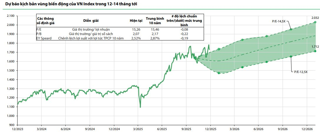 Nhóm phân tích dự báo VN-Index sẽ hướng đến vùng mục tiêu từ 1.712 đến 2.032 điểm trong 12–14 tháng tới. Kịch bản dự phóng được neo bởi EPS 2026F đạt khoảng 137–140 đồng (tăng 15%–19% so với cùng kỳ) và P/E mục tiêu 12,5x–14,5x. Đây là mức P/E thận trọng hơn so với cập nhật trước, phản ánh cân bằng giữa lực đẩy tăng trưởng và rủi ro vĩ mô/địa chính trị.