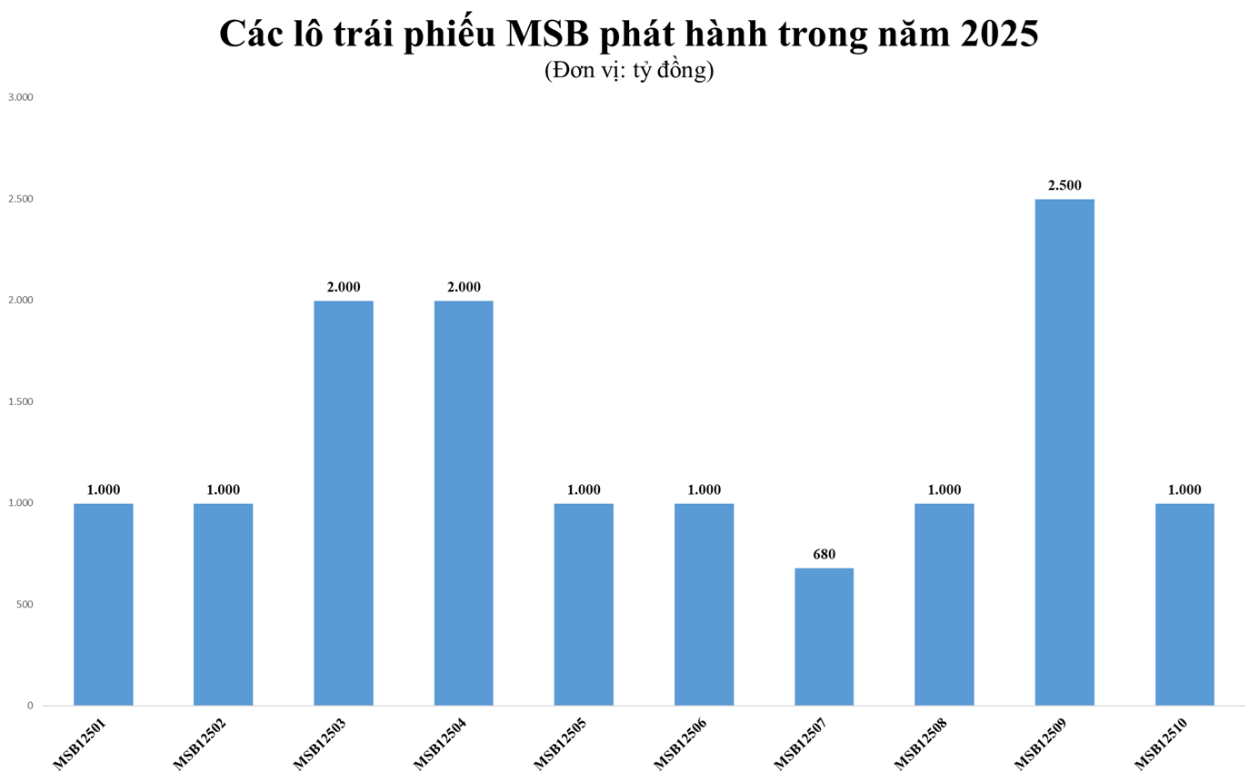 Trước đó, ngày 10/10, MSB đã phát hành lô trái phiếu mã trái phiếu MSB12509 với khối lượng 2.500 trái phiếu, tương đương giá trị thu về đạt 2.500 tỷ đồng, kỳ hạn 7 năm, đáo hạn vào ngày 10/10/2032.
