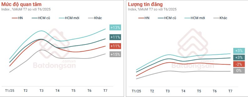 Bên cạnh đó, dữ liệu tháng 7/2025 cũng ghi nhận mức độ quan tâm đồng loạt tăng ở hầu hết các khu vực trên cả nước. Hai thị trường trọng điểm là Hà Nội và TP.HCM cũ đều tăng 11% về mức độ quan tâm so với tháng trước.
