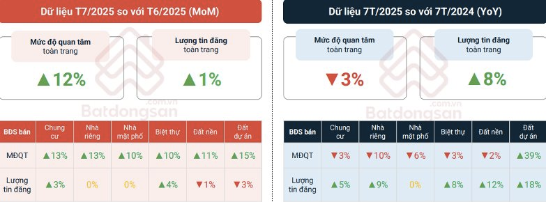 Trong bối cảnh kinh tế vĩ mô có nhiều điểm sáng, thị trường BĐS cũng cho thấy những diễn biến tích cực. Cụ thể, dữ liệu của Batdongsan.com.vn cho thấy, trong tháng 7/2025, mức độ quan tâm BĐS bán và BĐS cho thuê trên thị trường cả nước đã tăng lần lượt là 13% và 15% so với tháng trước.