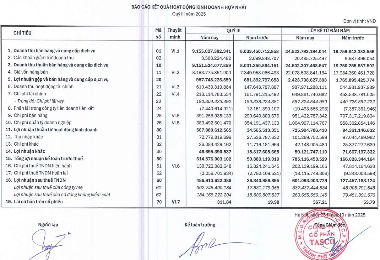 Báo cáo tài chính quý 3 cho thấy doanh thu của Tasco đạt hơn 9,1 ngàn tỷ đồng, tăng 14%; trong khi lợi nhuận gộp từ hoạt động cốt lõi tăng tới 40%, lên gần 958 tỷ đồng, chỉ thấp hơn mức đỉnh 992 tỷ đồng của quý 4/2024, giai đoạn thị trường ô tô được hưởng chính sách giảm 50% lệ phí trước bạ.