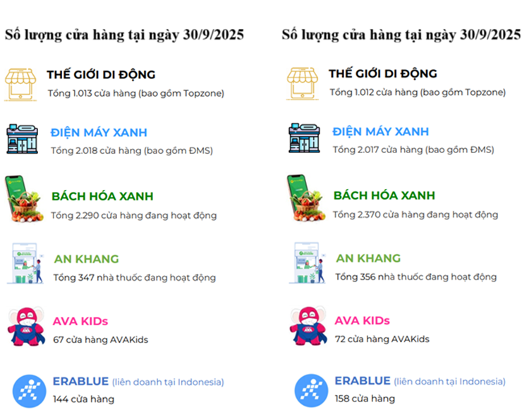 Như vậy, tính đến cuối tháng 10/2025, MWG sở hữu 1.012 cửa hàng Thế Giới Di Động, 2.017 cửa hàng Điện Máy Xanh, 2.370 cửa hàng Bách Hóa Xanh, 356 nhà thuốc An Khang, 72 cửa hàng AvaKids và 158 cửa hàng EraBlue.