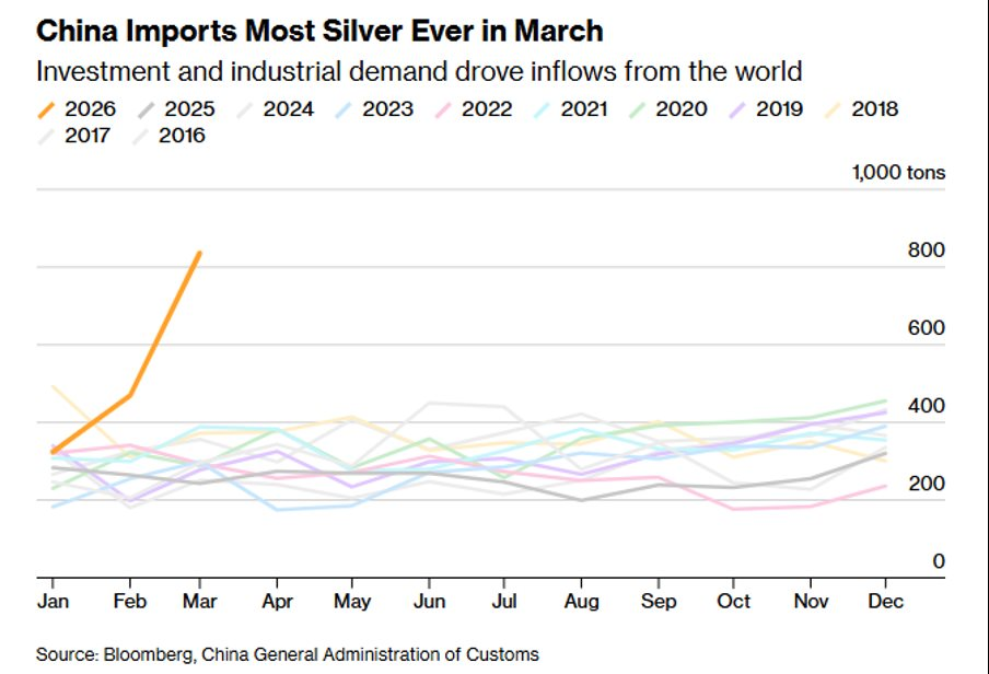 Không đứng ngoài cuộc chơi, Trung Quốc cũng đã hành động khi dữ liệu cho thấy quốc gia này đã tăng khối lượng nhập khẩu bạc trong tháng 3 lên mức cao kỷ lục.