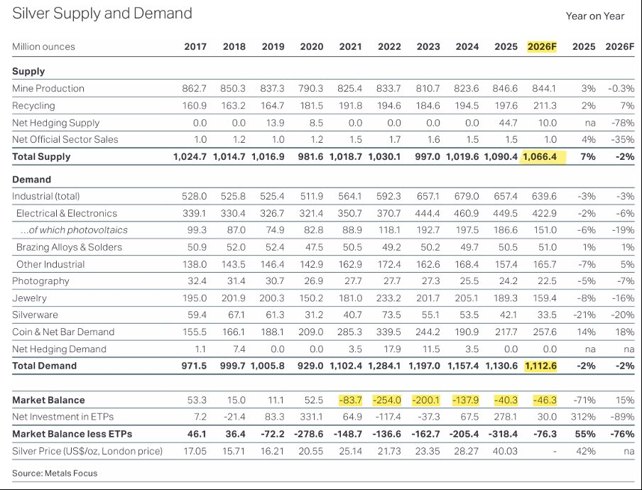 Điều này càng làm thị trường bạc trở nên thắt chặt hơn bao giờ hết khi dữ liệu từ Viện Bạc (The Silver Institute) cho thấy thị trường kim loại quý này đang đối mặt với năm thâm hụt thứ 6 liên tiếp với mức tổng thâm hụt lũy kế có thể đạt hơn 23,7 nghìn tấn, tương đương hơn 70% tổng sản lượng sản xuất toàn cầu, vượt qua sản lượng bạc cần cho lĩnh vực công nghiệp.