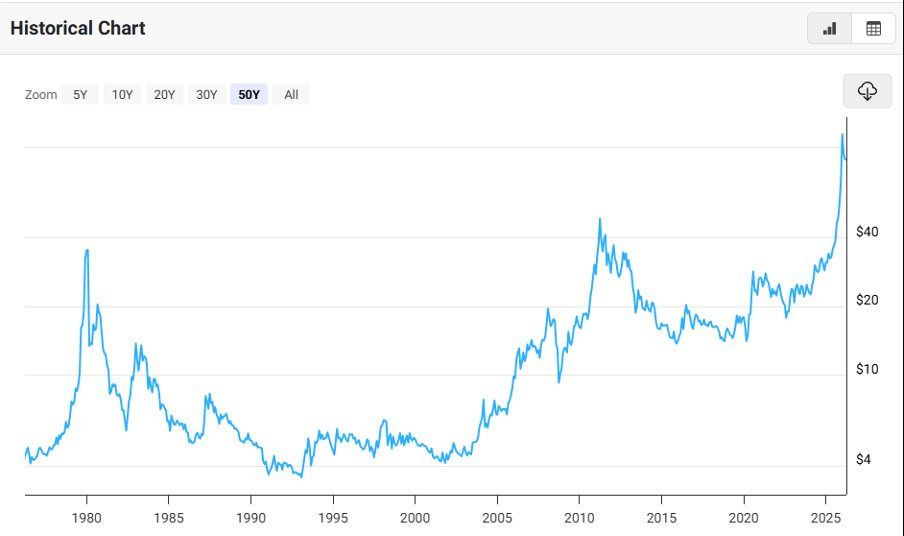Giá bạc đã có 10 tháng tăng liên tiếp kể từ tháng 5/2025, thiết lập mức kỷ lục 121 USD/ounce vào đầu năm 2026 vừa qua. Bất chấp đà suy yếu từ vùng này, mức giá trung bình hơn 3 tháng qua của bạc vẫn đạt gần 78 USD.