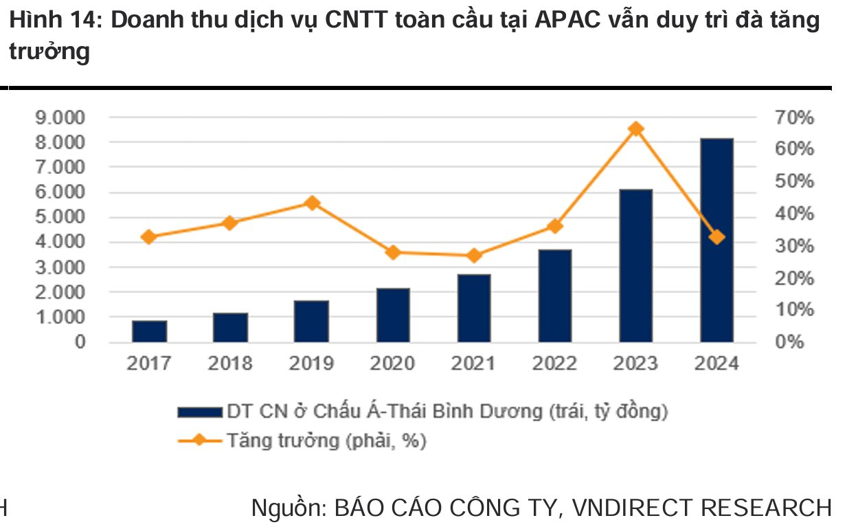 Hơn nữa, FPT cũng đã mở rộng thành công sự hiện diện của mình tại Malaysia, Indonesia và Thái Lan. Do đó, trong năm 2024, VNDIRECT ước tính thị trường Châu Á – Thái Bình Dương sẽ tăng trưởng 33% so với cùng kỳ.